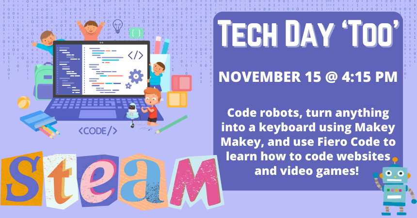 Friday, November 15, 2024 | 4:15 to 5:15pm United States Join us Fridays at 4:15 pm for fun with science, community partners, and more! Grades K-12. TECH DAY TOO: November 15. Come play with all kinds of tech! Audience Kids Teens