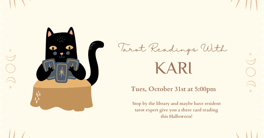 Tuesday, October 31, 2023 | 5 to 7pm United States Stop by the library on Halloween and get a three-card tarot reading from local expert Kari! First come, first served starting at 5:00 pm on Tuesday, October 31! Audience Adults
