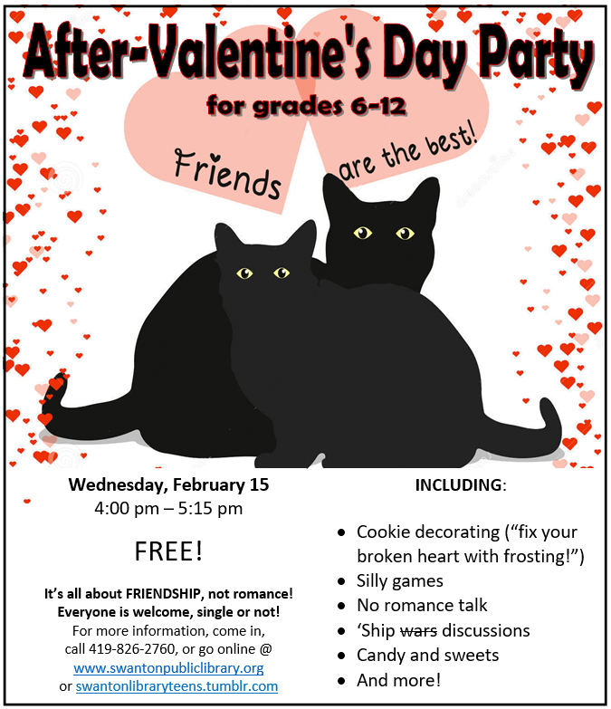 Not in a relationship? Or just don’t care about all that romance stuff? Come to the library from 4:00 pm to 5:15 pm on Wednesday, February 15 for an after-Valentine’s Day party that’s all about celebrating friendship instead of romance – and sweets! We’ll have broken heart cookies to decorate and silly icebreaker games to play. Only talking about fictional relationships (‘ships’) is allowed! Everyone is welcome, single or not. Registration is not required. Grades 6-12. FREE!
