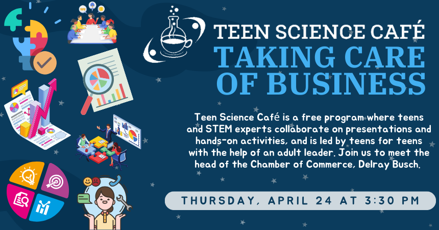 Teen Science Café is a free program where teens and STEM experts collaborate on presentations and hands-on activities, and is led by teens for teens with the help of an adult leader. Join us at 3:30 pm on Thursday, April 24 to meet the head of the Chamber of Commerce, Delray Busch.