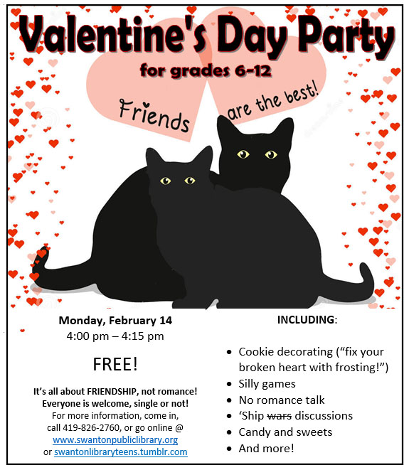 Not in a relationship? Or just don’t care about all that romance stuff? Come to the library from 4:00 pm to 5:15 pm on Monday, February 14 for a Valentine’s Day party that’s all about celebrating friendship instead of romance – and sweets! We’ll have broken heart cookies to decorate and silly icebreaker games to play. Only talking about fictional relationships (‘ships’) is allowed! Everyone is welcome, single or not. Registration is not required. Grades 6-12. FREE!