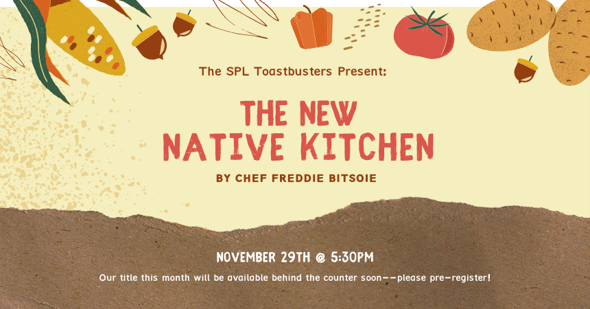 This month the club will focus on New Native Kitchen: Celebrating Modern Recipes of the American Indian by Freddie Bitsoie. Bring your favorite indigenous recipe with you and join us at 5:30 pm on Wednesday, November 29. Copies of this month’s cookbook are limited, so stop in, call, or register through our website as soon as you can!