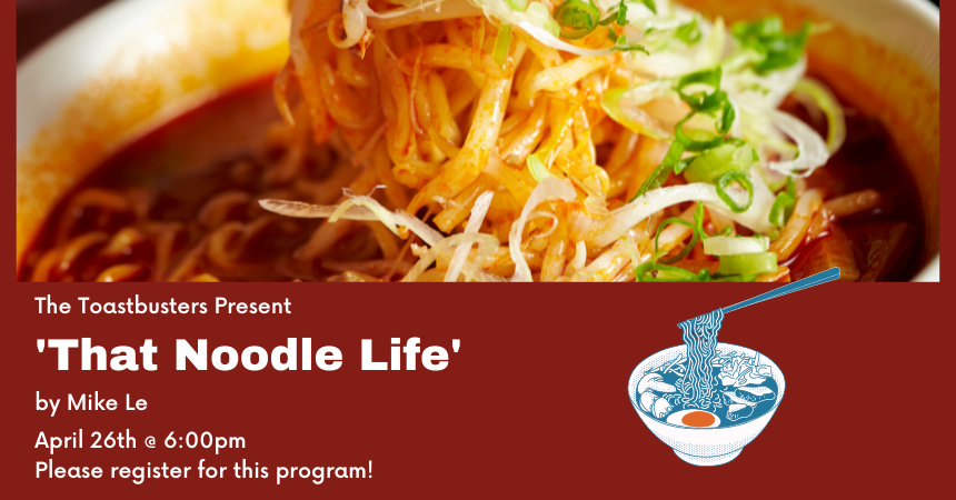 Want to learn to cook something new? Then join the Toastbusters Cookbook Club, a potluck-style club where attendees read the selected book, try out a recipe or two, and bring the results to share during a night of good food and good company! Check out That Noodle Life: Soulful, Savory, Spicy, Slurpy by Mike and Stephanie Le and join us on Wednesday, April 26 at 6:00 pm. Please register, as copies of the cookbook are limited!