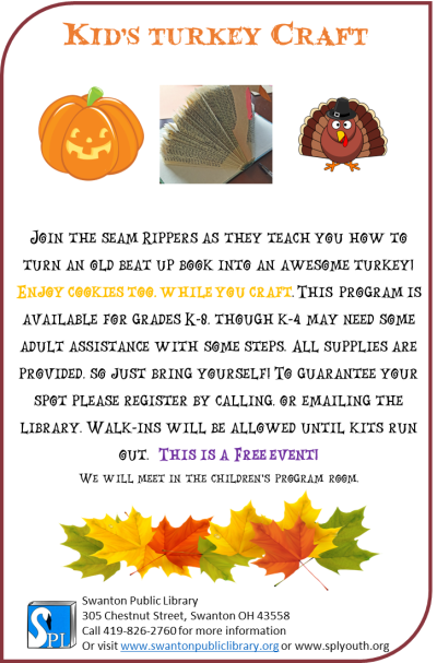 It’s Thanksgiving, and members of the local sewing club the Seam Rippers are back to show kids how to make a turkey craft using recycled books! Join them on Thursday, November 17 at 4:00 pm to make your own holiday turkey. Registration is requested but not required; please call us or come in!