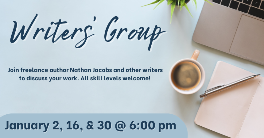 Thursday, January 2, 2025 | 6 to 8pm United States Thursdays, January 2, 16, and 30 at 6:00 pm. Join freelance author Nathan Jacobs and other writers to discuss your work. All skill levels welcome! Audience Adults