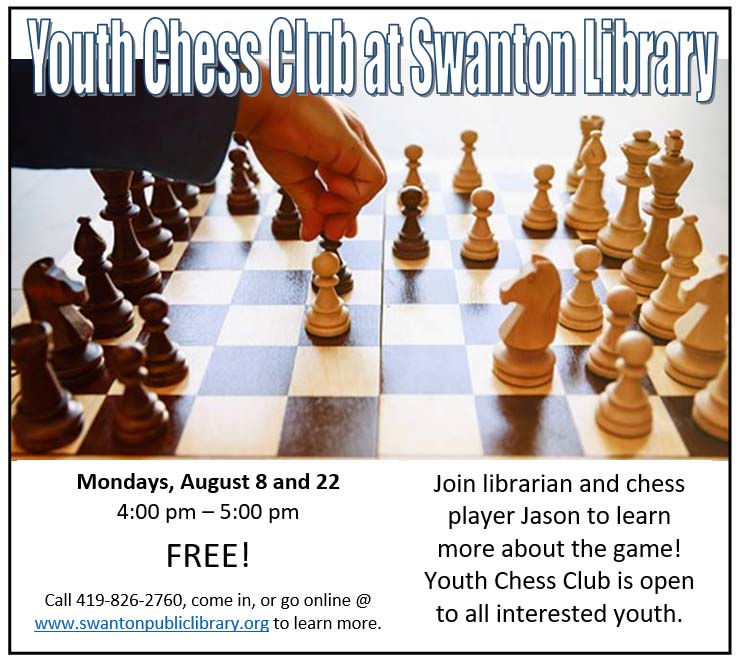 Monday, August 8, 2022 | 4 to 5pm United States Join librarian and chess player Jason on Mondays, August 8 and 22 at 4:00 pm, to learn about the game! Youth Chess Club is open to all interested youth. Audience Kids