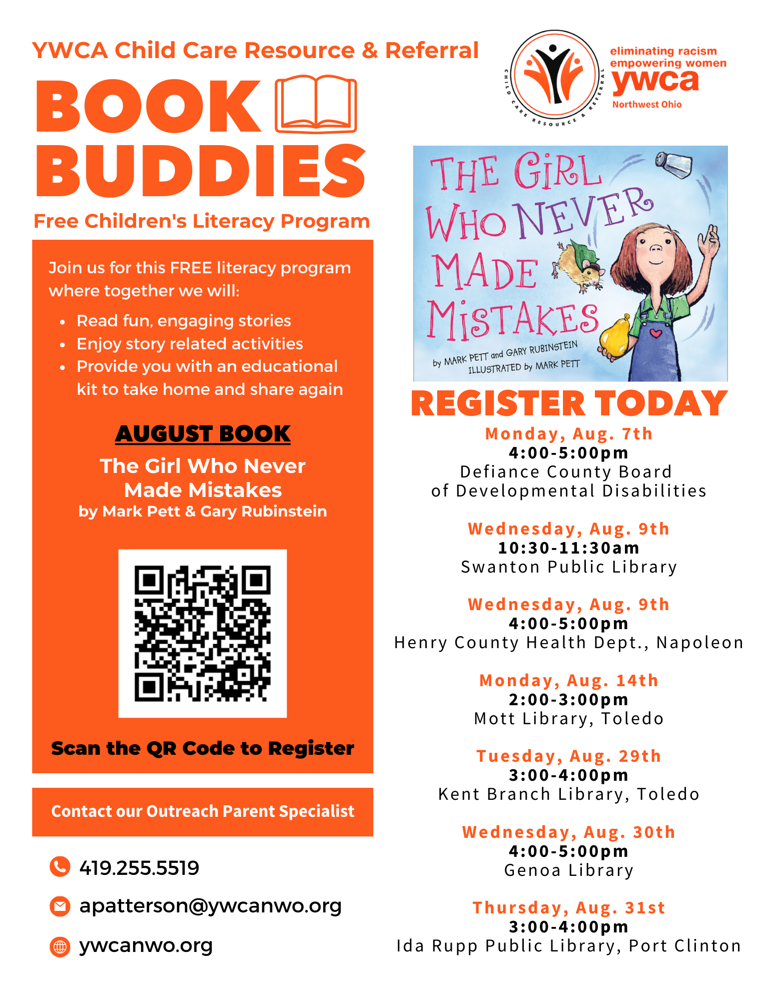 Book Buddies for preschool and elementary school kids continues! Join the YWCA at 10:30 am on Wednesday, August 9, for fun with books, crafts, and activities. Kids also receive a take-home kit including the book!